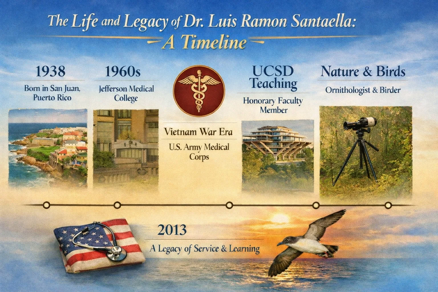 Dr. Luis Ramon Santaella lived a life defined by service, learning, compassion, and curiosity. His journey took him from Puerto Rico to leading academic institutions, distinguished military and medical service, teaching, scholarship, and a lifelong love of the natural world.